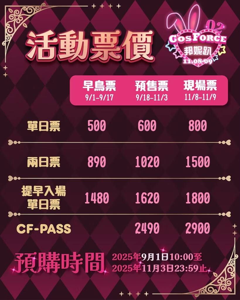 預售票 | CF-PASS | 2,490元 | 9月18日~11月3日 |