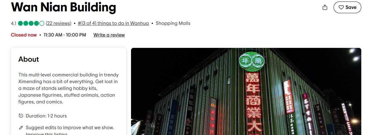 Tripadvisor: https://www.tripadvisor.ca/Attraction_Review-g13806951-d12287297-Reviews-Wan_Nian_Building-Wanhua_Taipei.html