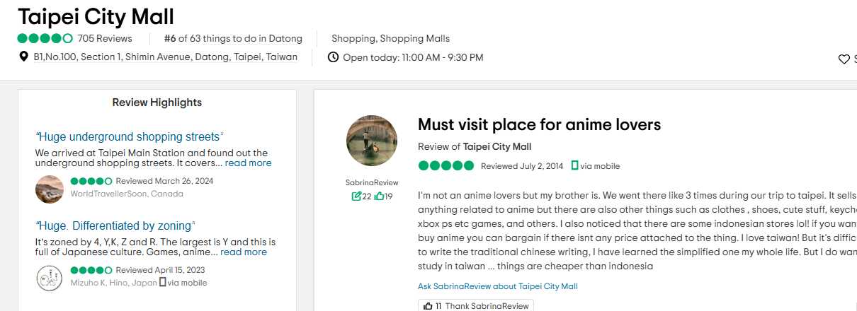 Tripadvisor: https://www.tripadvisor.ca/Attraction_Review-g13806451-d2049208-Reviews-Taipei_City_Mall-Datong_Taipei.html